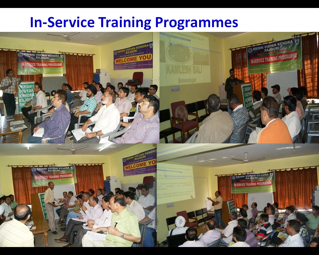In-service (Extension functionaries) Training Programmes are organized for field functionaries of Agriculture/Horticulture/Animal Husbandry & other Line departments of the district. The programmes are designed on latest technologies and interventions in the respective fields.